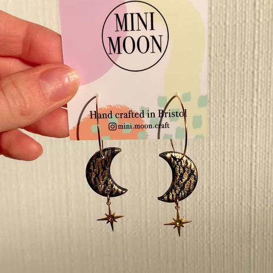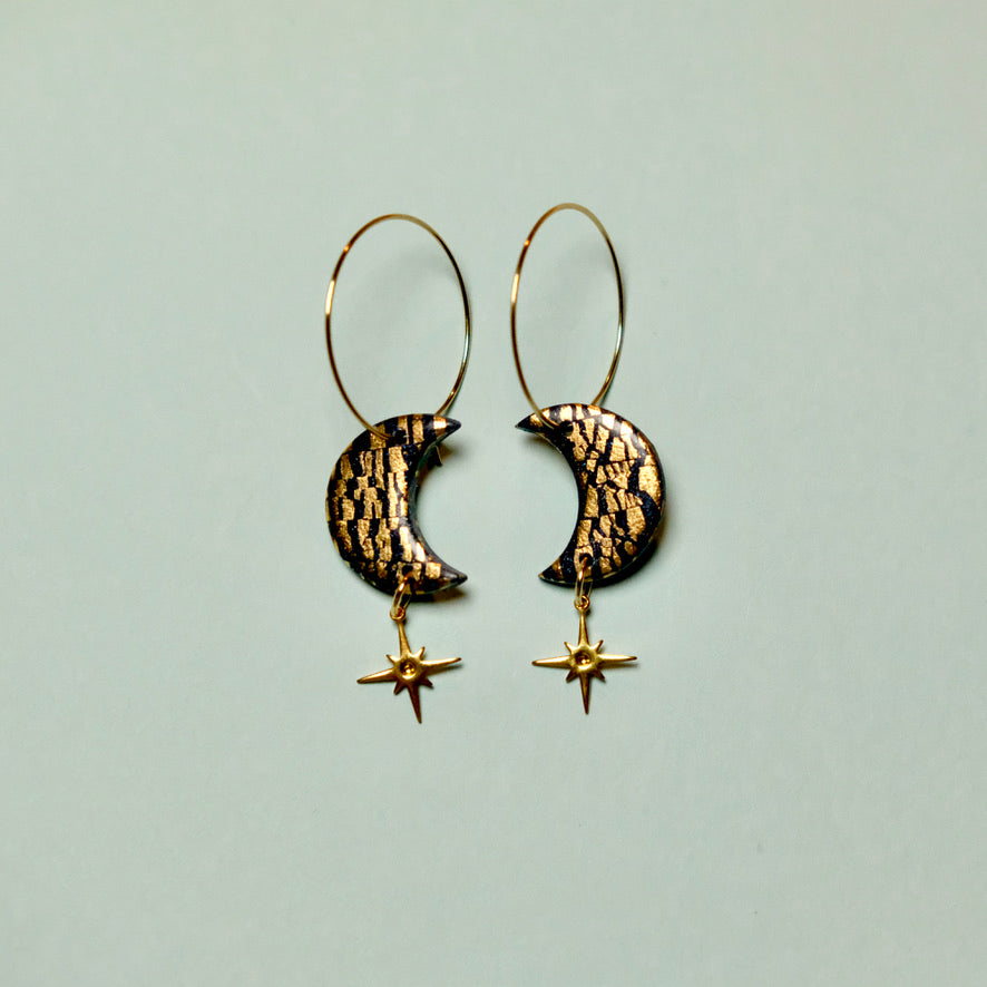Add a some sparkle to your look with our Golden Charmed Moons. Featuring shimmering gold leaf accents and a twinkling north star charm, these hoop earrings blend celestial charm with golden elegance. Let your style shine with a touch of cosmic magic!