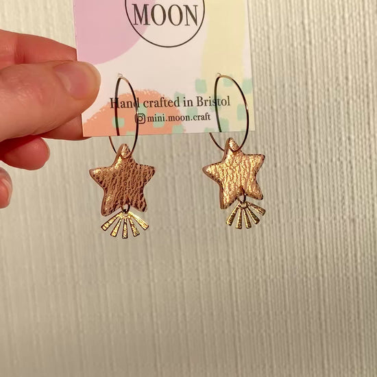 Dazzle your outfit with our Golden Shooting Star hoops! These hoop earrings combine celestial charm and gold elegance, featuring shimmering gold leaf accents and a shining charm. Bring some cosmic magic to your aesthetic and let your style shine!